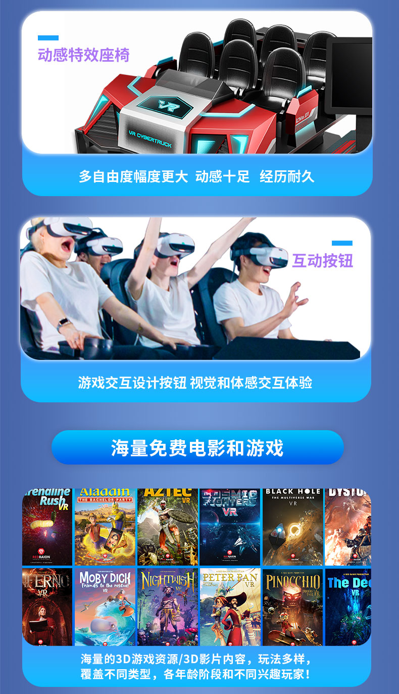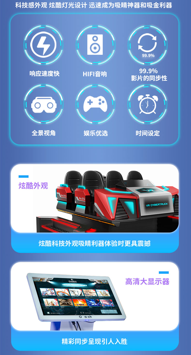 六人飛船以虛擬現實為主,科技感十足的外觀,可多人觀影,自由度動感平臺和獨立觸屏控制器,將視覺、觸覺和感覺完美地融為一體,使觀眾全身心融入劇情中。超強的互動性與趣味性給您帶來身臨其境般的體驗!